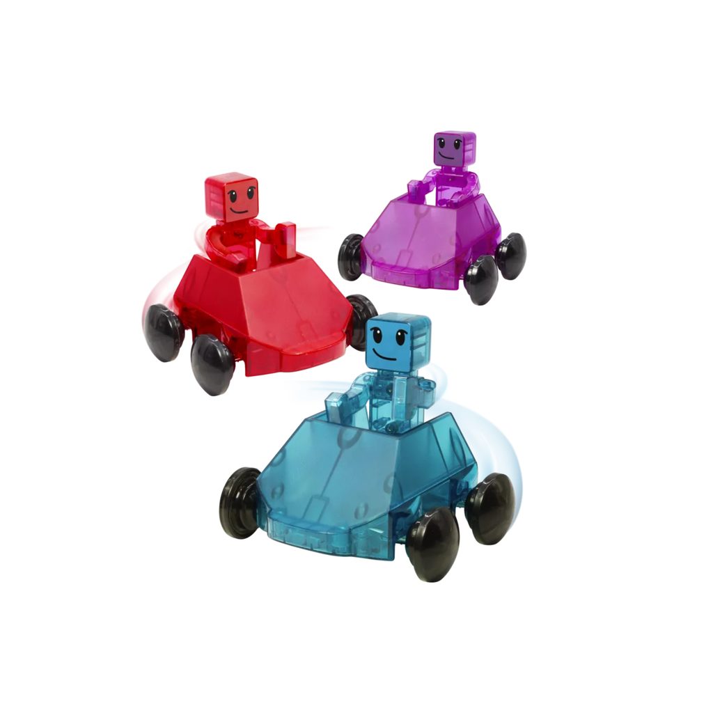 - Obsah balení: 3 vozidla (červená, modrá a fialová) a 3 figurky (červená, modrá a fialová).